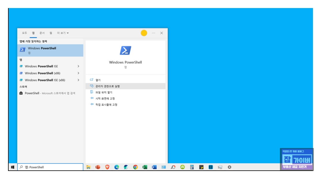 바탕화면 작업줄에서 검색창을 열고 'powershell'을 입력한 후, 'Windows PowerShell'을 관리자 권한으로 실행합니다.