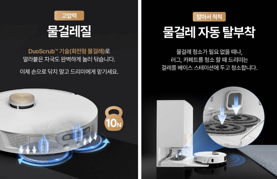 - 물걸레 관리: 온수 세척, 열풍건조 (70도), 세정제 자동투입