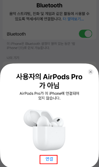 - 초기화가 완료되면, 아이폰 옆에 에어팟을 두고 블루투스 목록에서 다시 연결합니다.