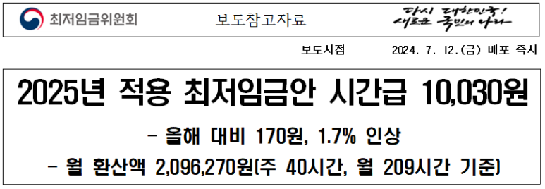 2025년 최저임금은 시간당 10,030원으로 발표되었으며 2024년 최저임금인 9,860원과 비교해서 170원이 인상되었습니다.