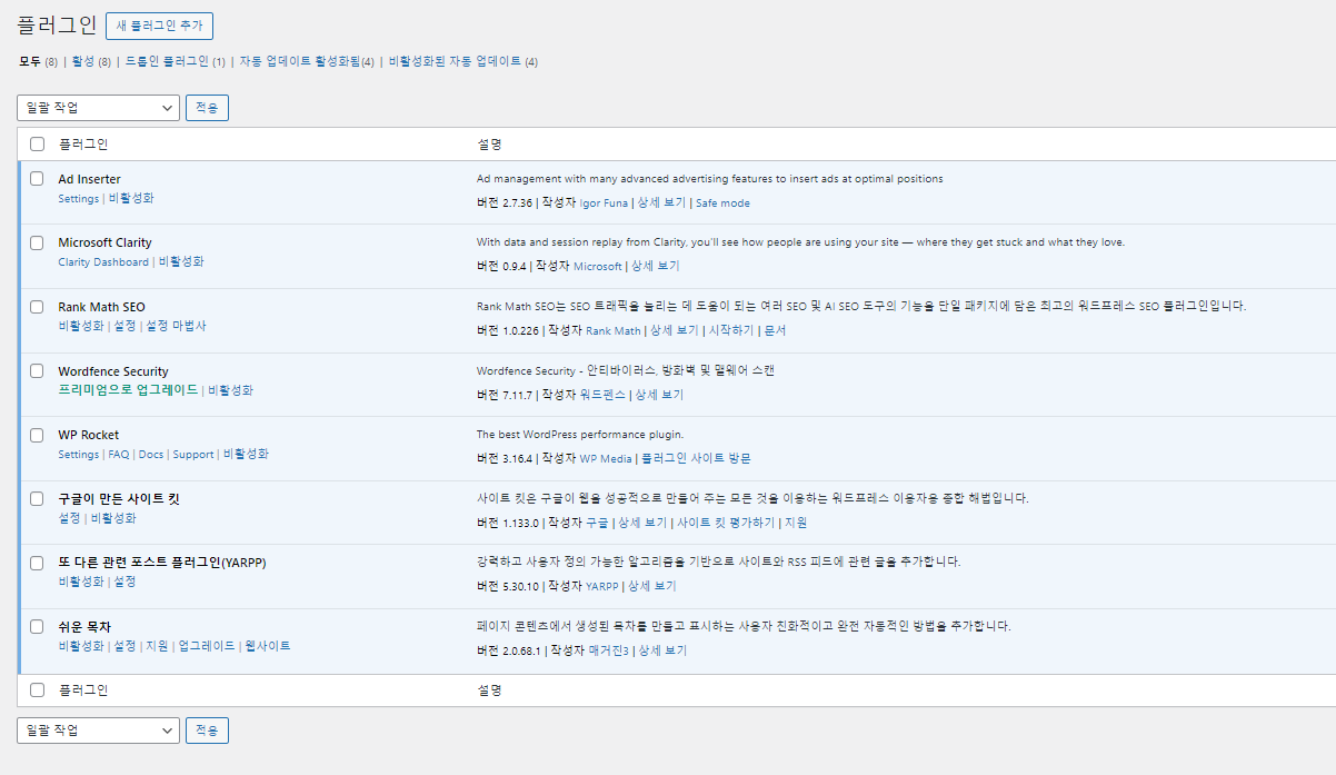 특히, 관리 페이지 속도에 영향을 미칠 수 있는 플러그인은 일시적으로 비활성화한 후 속도 변화를 확인해보는 것이 중요하며 이렇게 문제가 해결된다면 해당 플러그인을 대체할 수 있는 다른 플러그인을 찾는 것이 좋습니다.