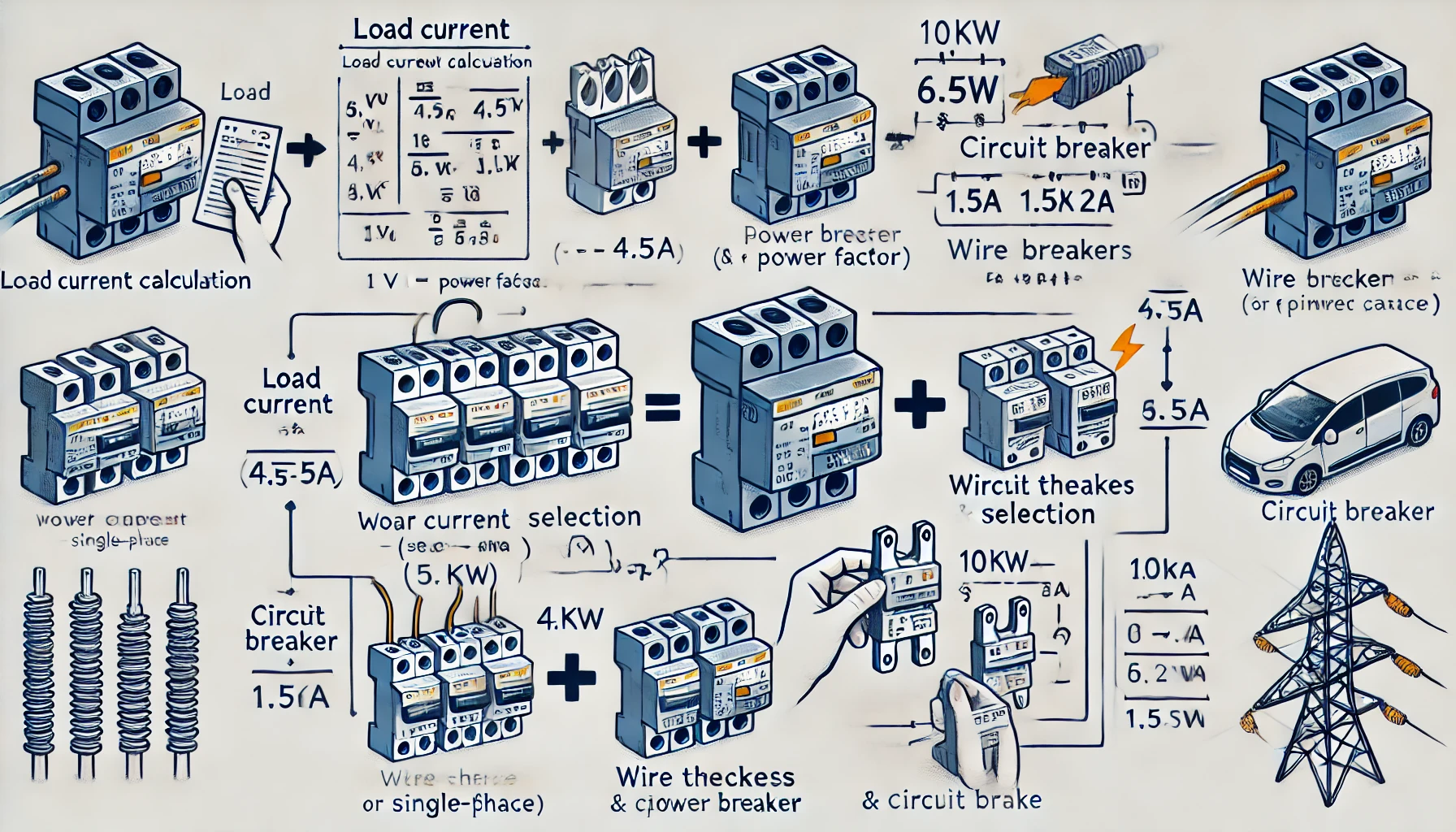전력 시스템에서 부하 전류에 따라 적절한 전선과 차단기를 선택하지 않으면 과열, 단락 또는 화재 위험이 발생할 수 있습니다.