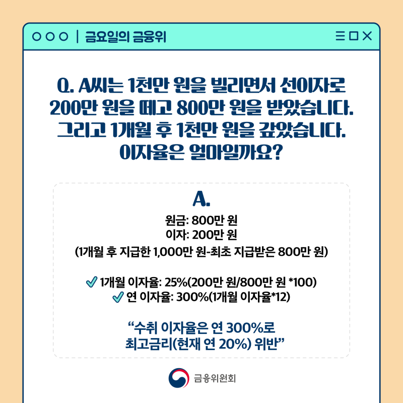 Q. 대출을 받았는데 계약서에 금리는 19.9%지만 실제 상환 조건이 25%에 가깝다면?