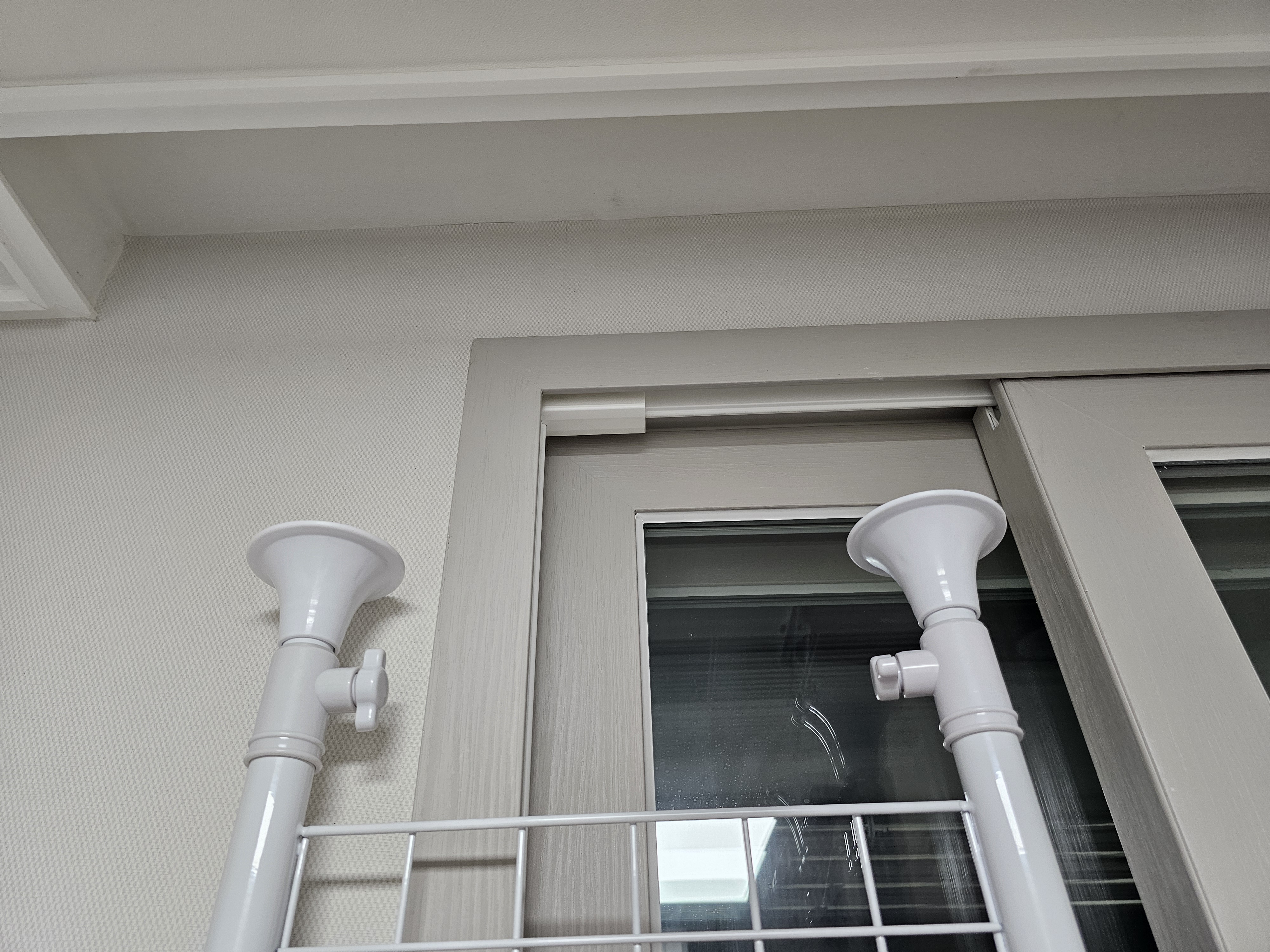 간단하게 조립 끝낸 뒤 바닥에 조립을 마친 후 천장에 설치할 때는 벨브를 돌려 스프링을 이용해 고정하는 방식이었는데, 이 과정에서 약간의 아쉬움이 남았습니다. 스프링이 탄력을 주며 고정되지만, 단단하게 고정되는 느낌은 아니어서 살짝 불안했습니다.