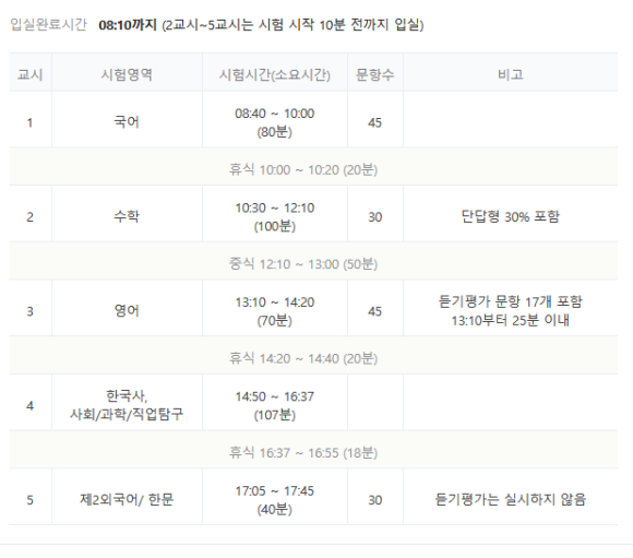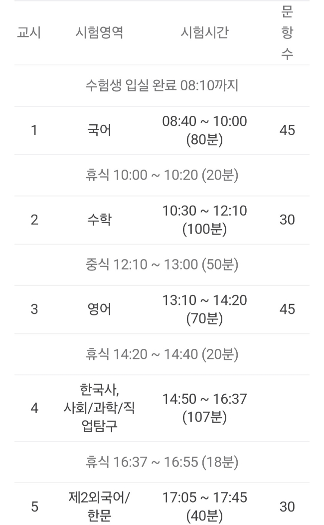 - 국어: 08:40 ~ 10:00 (80분, 문항 수 45개)