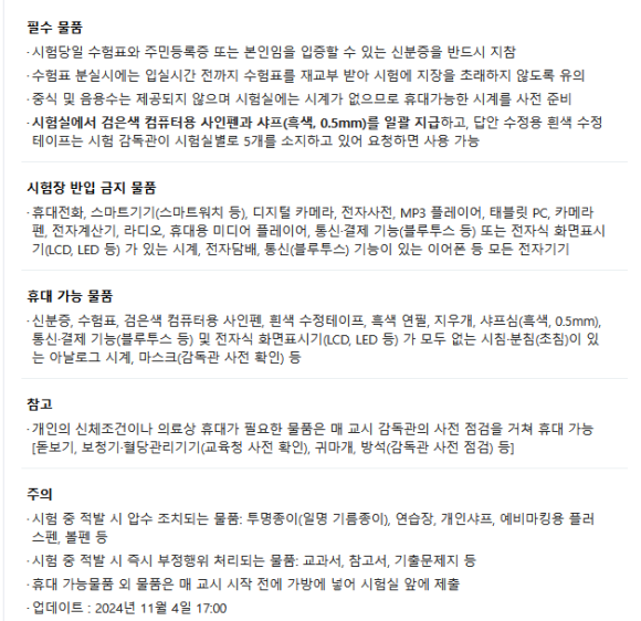 - 수험표 및 신분증: 시험 입실 기준이 되며, 신분증 미지참 시 입실 불가
