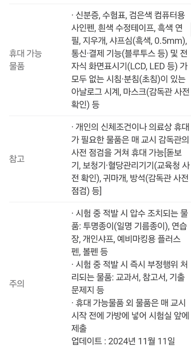 - 특별 허용: 의료상 필요한 물품 (도보기, 보청기, 혈당관리기 등)은 감독관의 사전 점검 후 휴대 가능