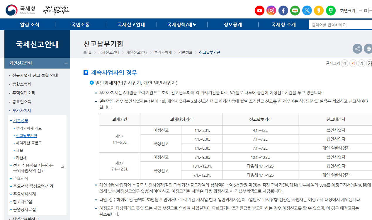 법인사업자와 일부 개인 일반과세자가 대상이며, 예정신고는 1년에 두 번 진행됩니다.