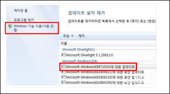 - KB971033이라는 업데이트가 있다면 삭제합니다.