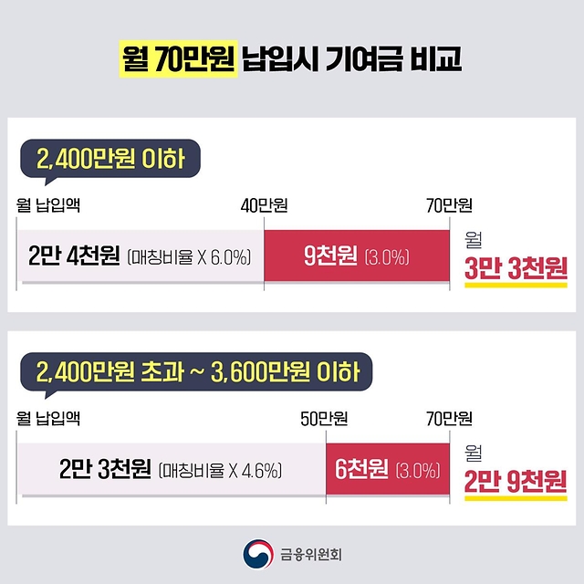 월 납입 한도 70만 원까지 모든 소득 구간에서 확대 적용 (매칭 한도 초과 구간: 매칭 비율 3%) |