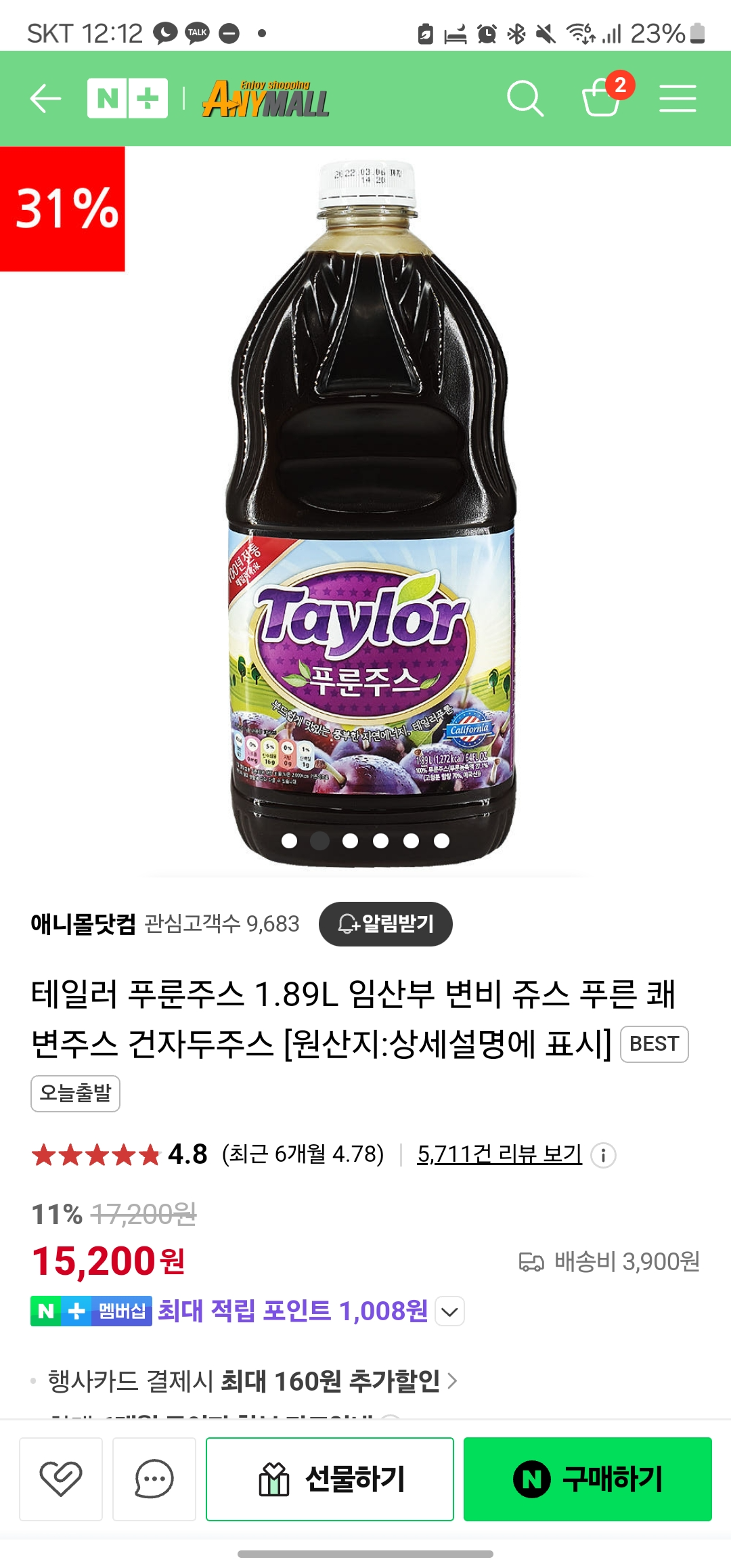 테일러 브랜드의 푸룬주스를 선택한 것은 리뷰 점수가 높고 사용자 후기가 많은 점이 눈에 띄었기 때문입니다.