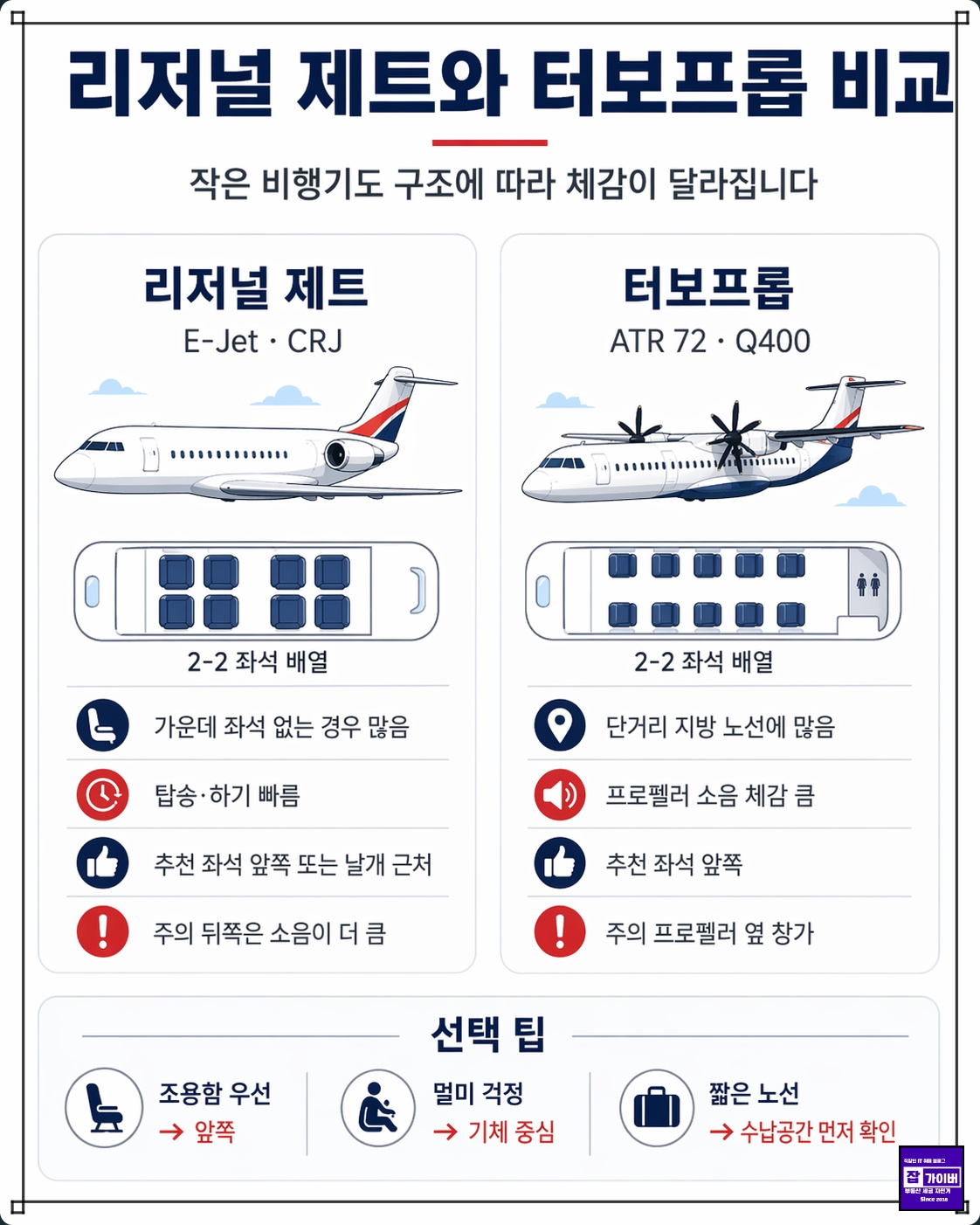 터보프롭은 구조상 불안정해서가 아니라, 체감상 더 시끄럽고 진동이 올라오는 쪽이라고 이해하면 쉽습니다. 그래서 앞쪽 좌석이 훨씬 편합니다.