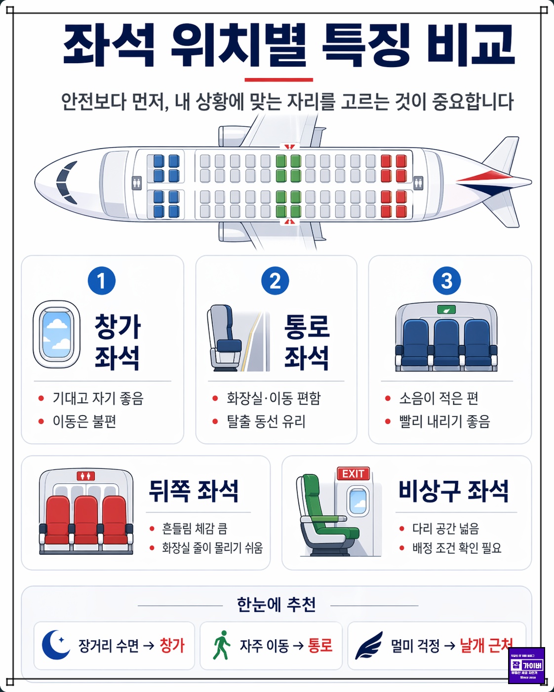비행기 좌석은 “절대 안전한 자리”를 찾기보다 내가 어떤 점을 더 중요하게 보는지부터 정리하는 편이 좋습니다.