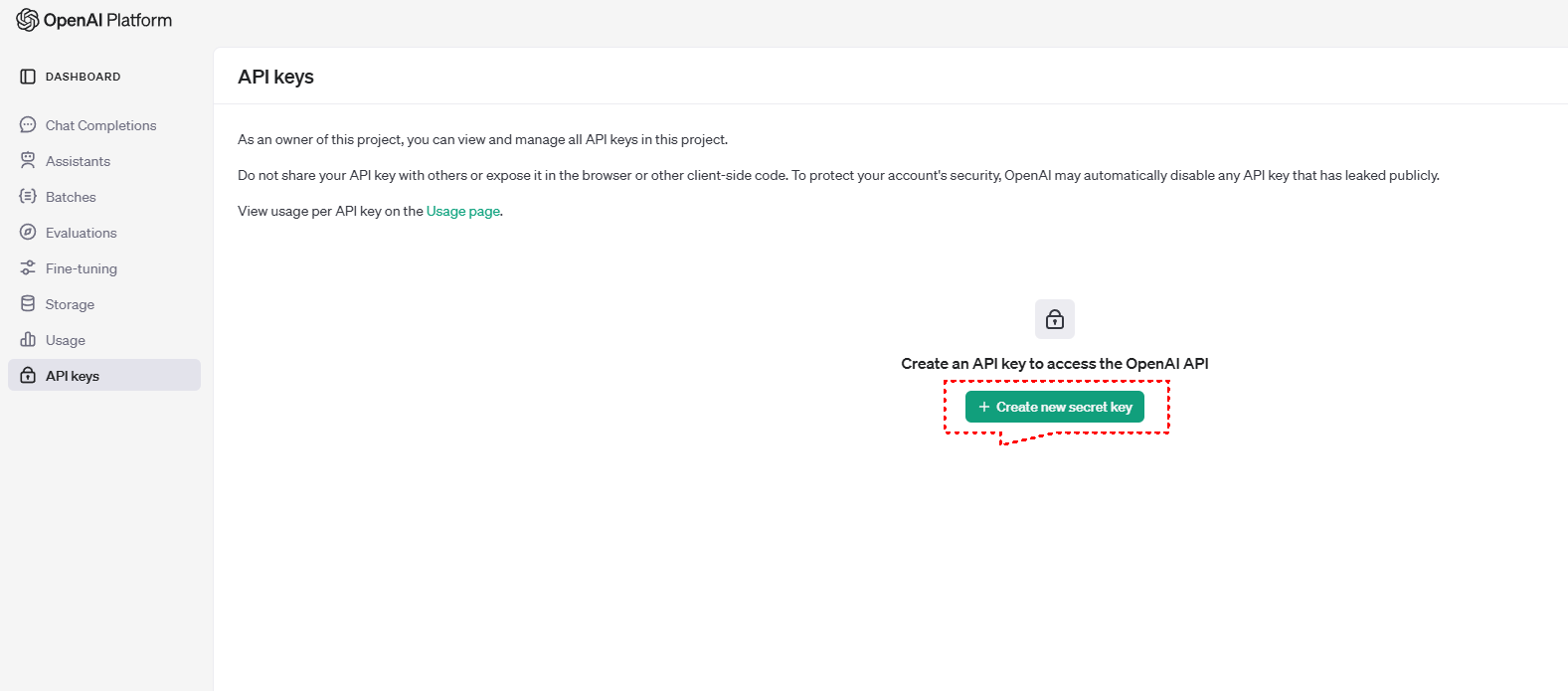 API 키 관리 화면에서 "Create new secret key" 버튼을 누릅니다.