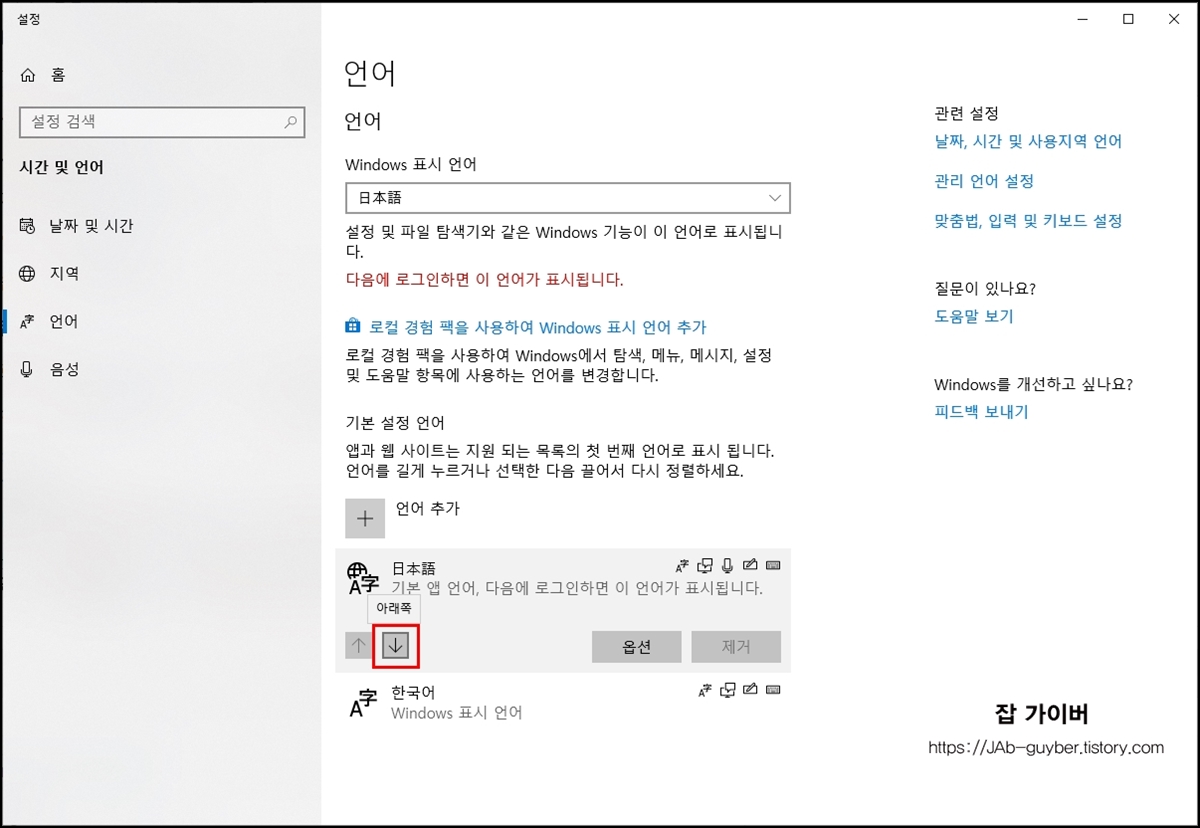 - 설정 > 시간 및 언어 > 언어에서 한글 언어팩이 제대로 설치되어 있는지 확인합니다.