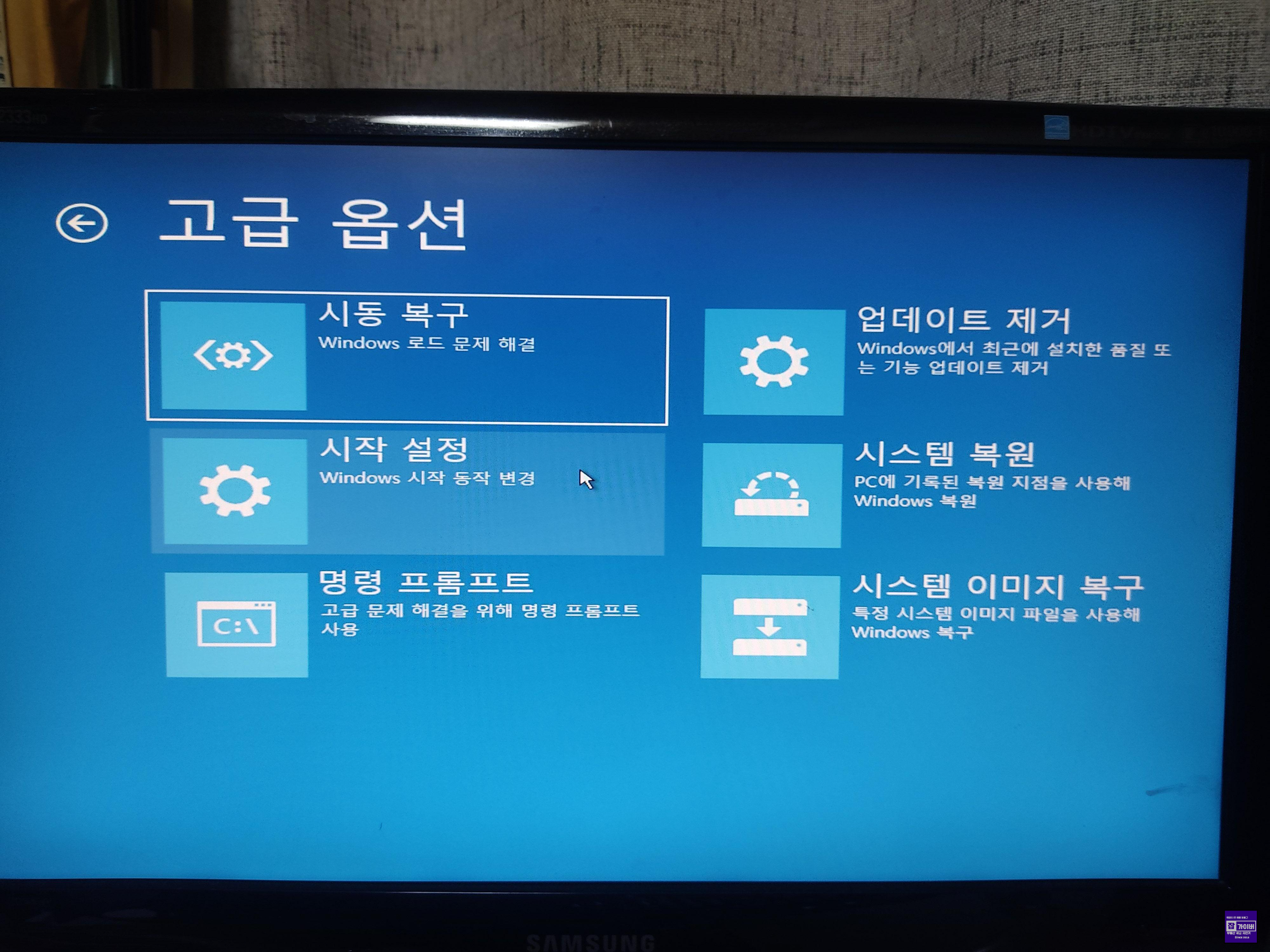 - 문제 해결 > 고급 옵션 > 시작 복구(Start-up Repair)를 선택합니다.
