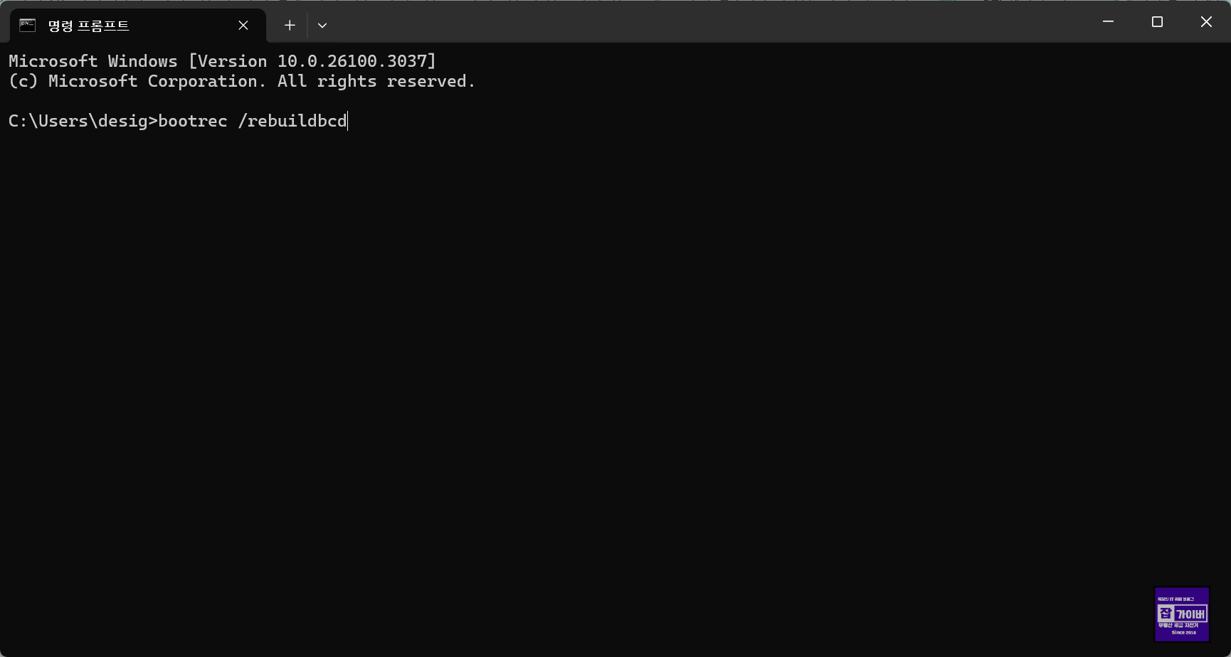 bootrec 명령어가 실패하거나 "Total identified Windows installations: 0" 메시지가 나오는 경우, BCD 파일 자체가 손상됐거나 Windows 파티션이 올바르게 마운트되지 않았을 수 있습니다.