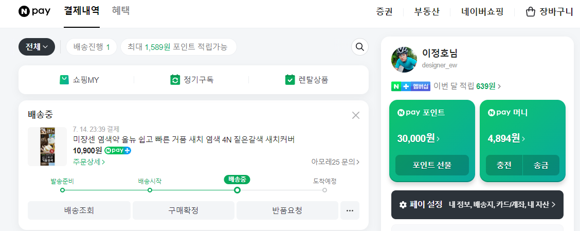 - 네이버에 로그인 후, 상단의 'Pay' 아이콘 클릭