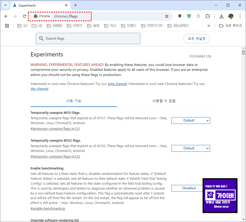- 크롬 주소창에 'chrome://flags'를 입력하고 Enter를 누릅니다.