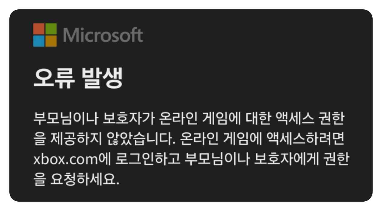 “부모님이나 보호자가 온라인 게임에 대한 액세스 권한을 제공하지 않았습니다. 온라인 게임에 액세스하려면 xbox.com에 로그인하고 부모님이나 보호자에게 권한을 요청하세요.”