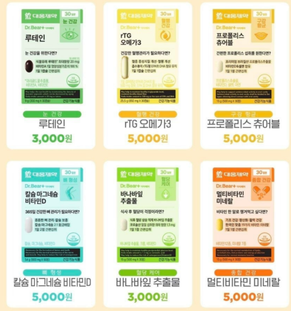 대웅제약 | 닥터베어 (26종) | 밀크씨슬, rTG 오메가3, 종합비타민, 루테인, MSM, 칼슘, 마그네슘, 코엔자임Q10, 녹차 카테킨, 가르시니아 등 |
