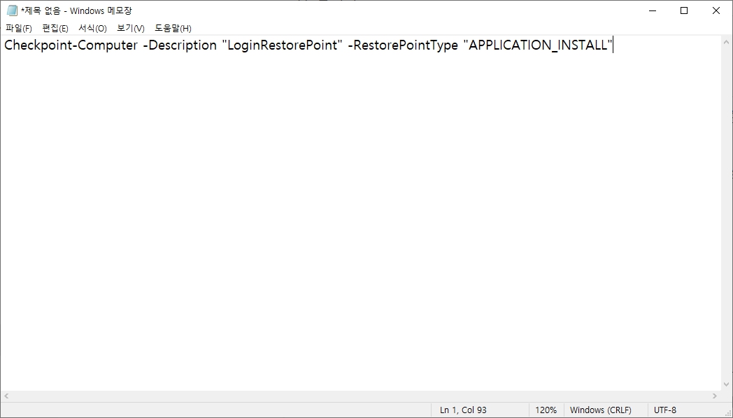 복원 지점을 자동으로 생성하려면 PowerShell 스크립트를 작성해야 합니다. 아래의 스크립트를 메모장에서 입력한 후, .ps1 확장자로 저장합니다.