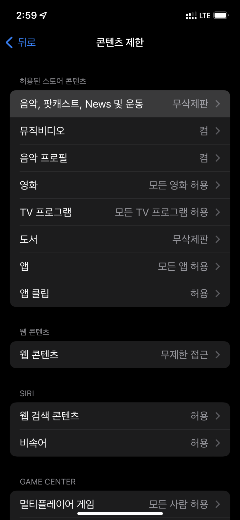 - 음악, 팟캐스트, 뉴스 항목을 찾아서 무삭제판 또는 제한 없음으로 맞춰 줍니다.
