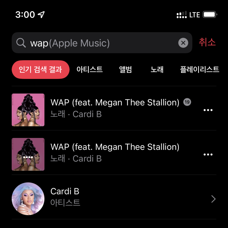 정상적으로 설정이 완료되면 대표적으로 WAP 같은 19금 곡의 무삭제판과 클린 버전이 동시에 검색되고, 곡 선택 시 인증 팝업 없이 바로 재생되는 모습을 볼 수 있습니다.