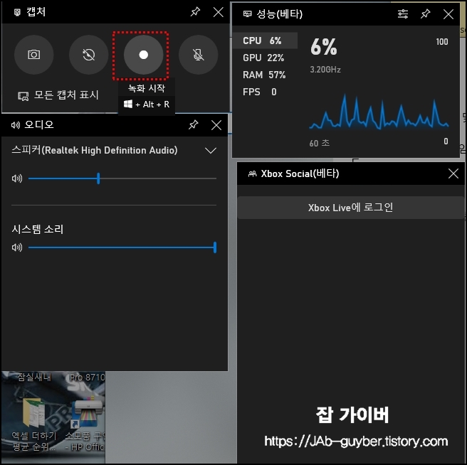 그리고 게임이나 화면을 녹화하고 싶을때는 Windows 키 + Alt + R 키를 눌러줍니다.