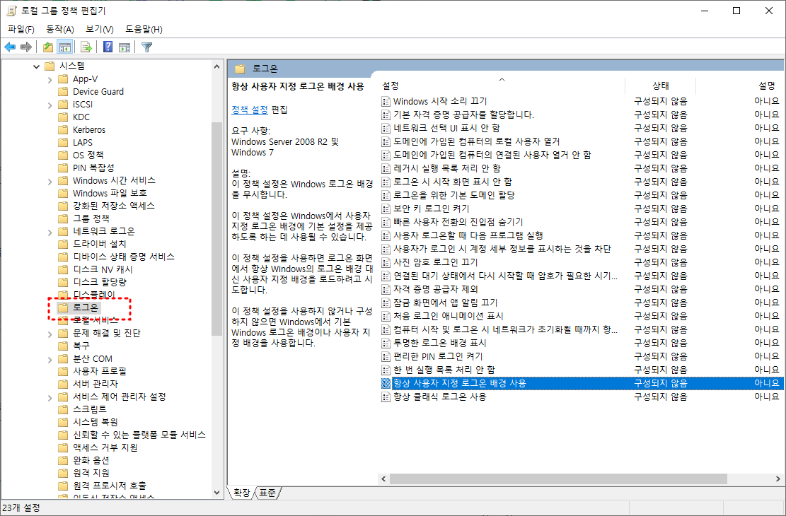 컴퓨터 구성 > 관리 템플릿 > 시스템 > 로그온