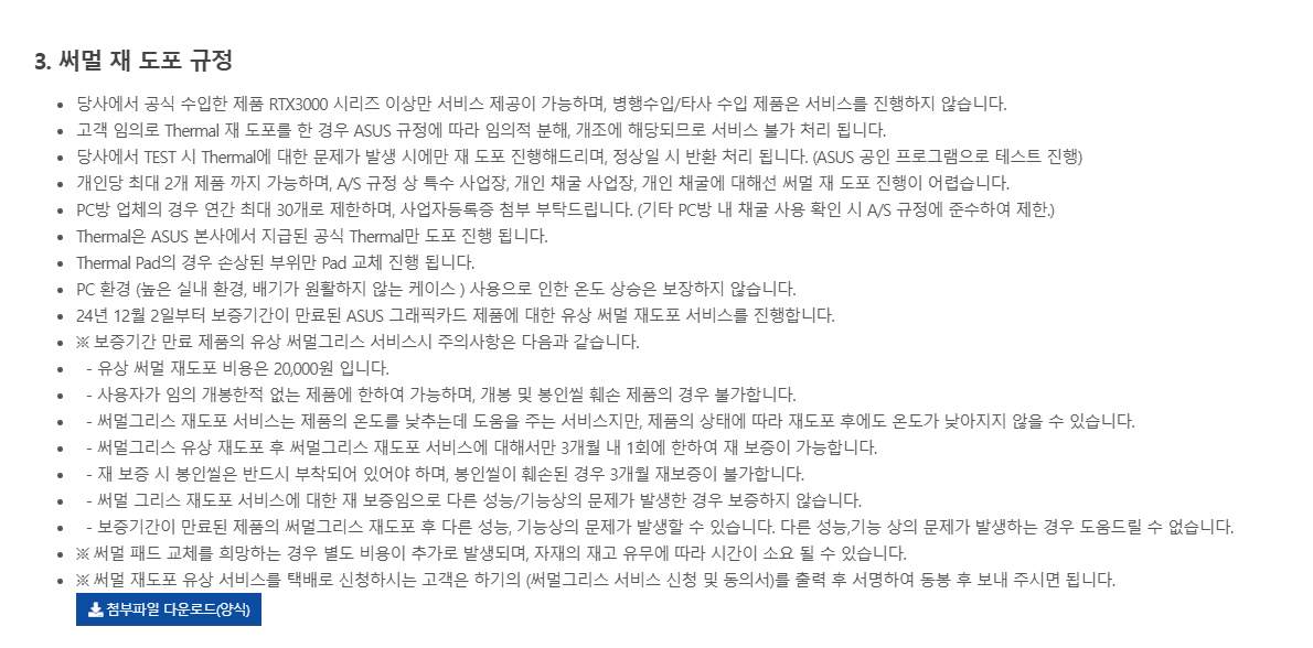 비용은 써멀그리스 재도포만 할 경우 2만 원이며, 써멀패드 교환이 필요한 경우 추가 비용이 발생합니다. 단, 이 서비스는 ASUS 센터의 공인 테스트에서 문제가 확인되어야만 무상으로 적용되며, 이상이 없을 경우에는 제품이 그대로 반송됩니다.