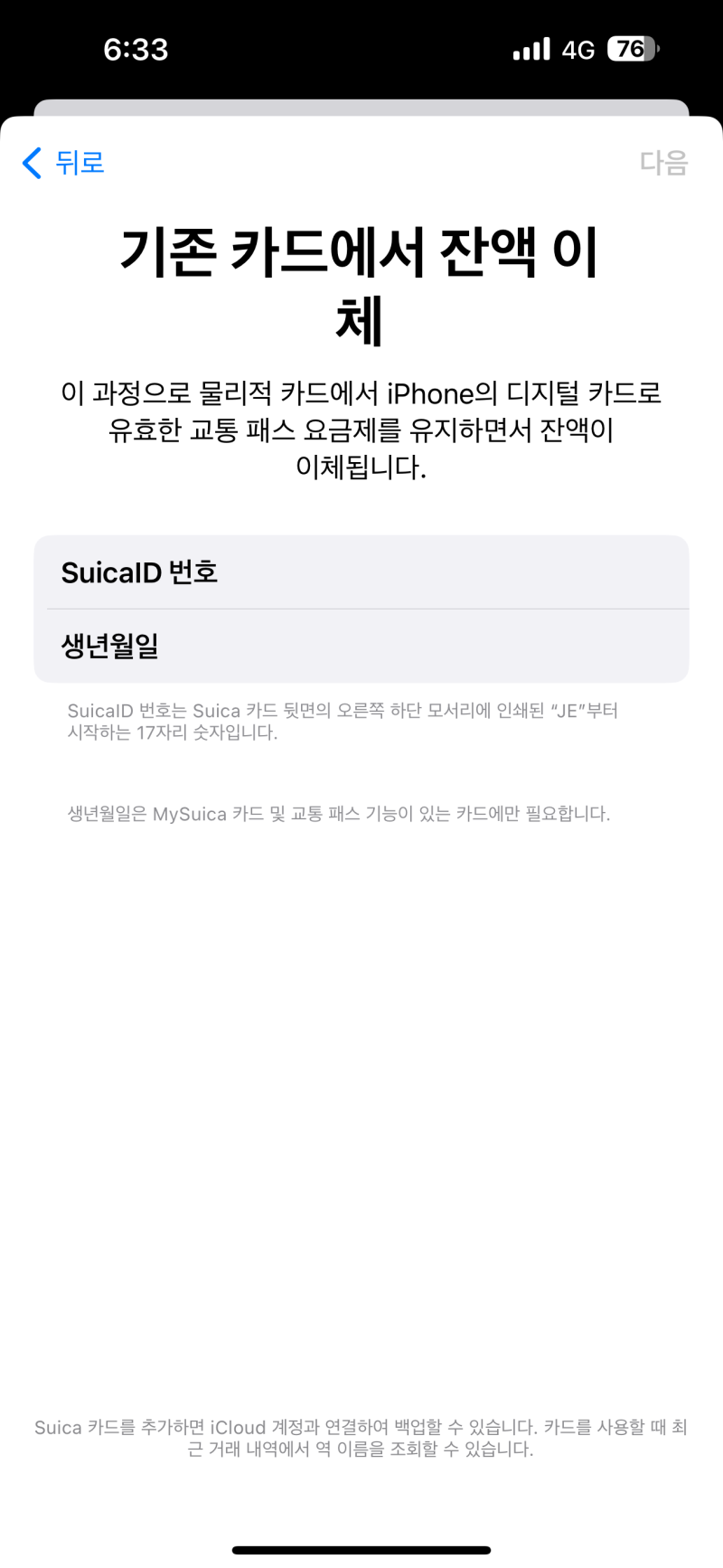 실물 카드 뒷면의 Suica ID 번호와 카드를 개설한 사람의 생년월일을 입력합니다. - 카드 뒷면을 아이폰 상단 뒷면에 맞대고 기다리면 잔액이 자동으로 이체되며 등록이 완료됩니다.