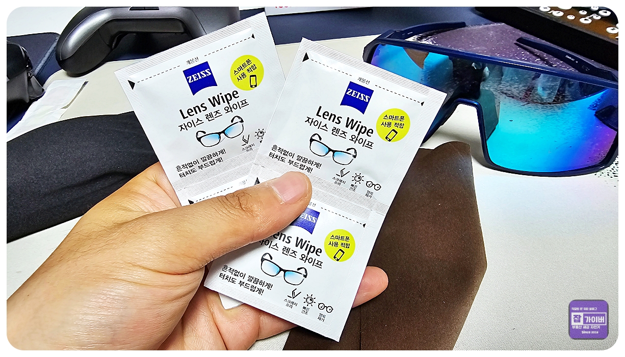 박스를 열어보면 렌즈 외에도 칼자이쯔 렌즈 클리너 와이프가 4개 들어 있고, 고급 융과 고글 파우치도 함께 제공됩니다. 교체는 간단했고, 마운트 고정력도 훌륭해서 별도 공구 없이 쉽게 끼울 수 있었어요.