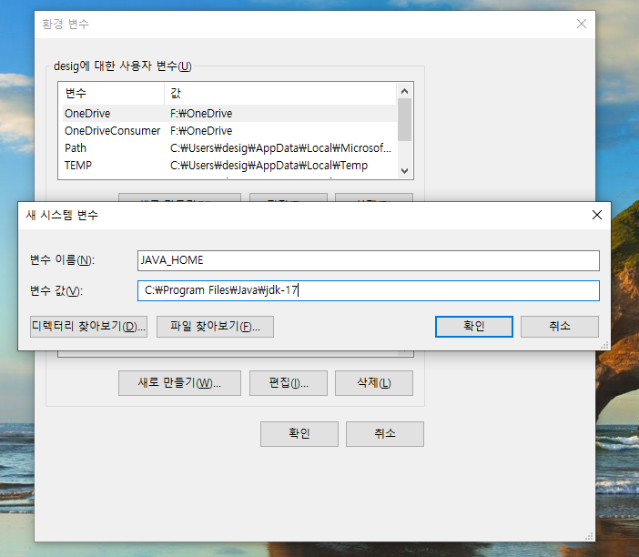 고급 시스템 설정 > 환경 변수에서 JAVA_HOME 변수명으로 Java 설치 경로(예: C:\Program Files\Java\jdk-17)를 지정해줍니다.