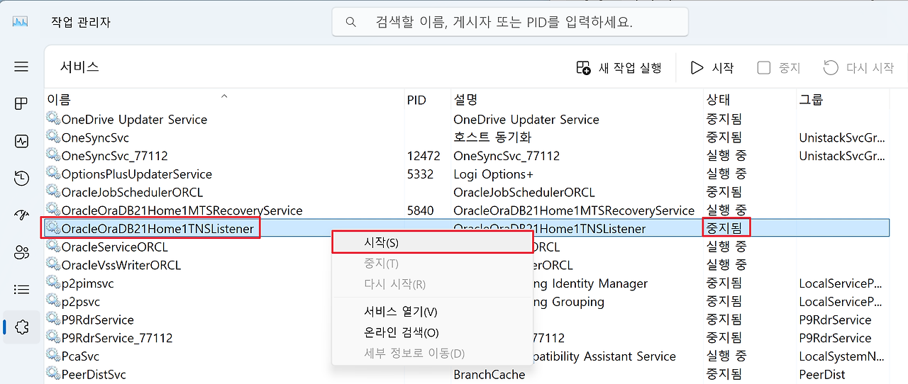 작업 관리자(Task Manager) → Oracle Listener 프로세스가 실행 중인지 확인하기 위해 CMD를 실행 후 아래명령어를 입력합니다.