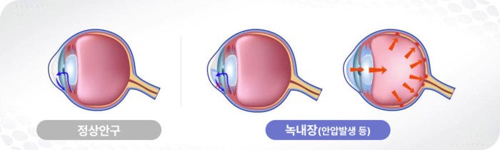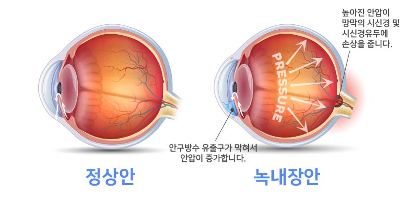 눈 속에서 만들어지는 방수액이 제대로 빠져나가지 못하면 압력이 상승하고, 이로 인해 시신경이 눌리거나 손상되면서 기능을 잃게 됩니다. 하지만 앞서 언급한 정상안압녹내장의 경우처럼 안압이 정상이더라도 시신경이 약한 사람은 손상이 시작될 수 있습니다.