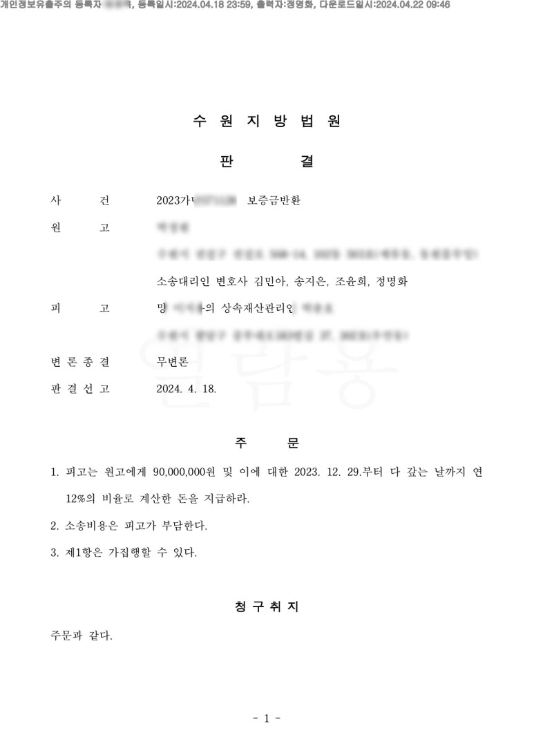 이후 상속재산관리인을 상대로 보증금 반환 소송을 제기했고, 법원은 소장 접수일을 계약 해지일로 인정하여, 보증금 전액 반환 및 지연이자 지급 판결을 내렸다. 불확실하고 지지부진할 수 있는 절차였지만, 변호사의 전략적 대응과 신속한 움직임 덕분에 4개월 만에 승소 판결을 이끌어낼 수 있었다.