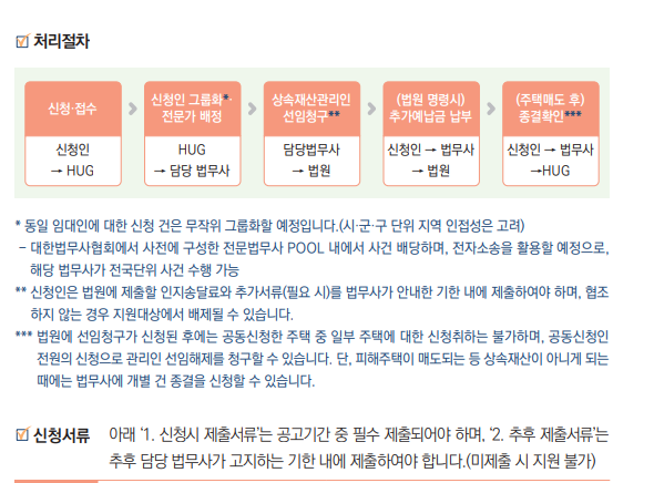 예를 들어 상속재산관리인 신청은 HUG 안심전세포털을 통해 신청해야 하며, 소송대리 지원은 대한변협법률구조재단을 통해 이루어집니다.