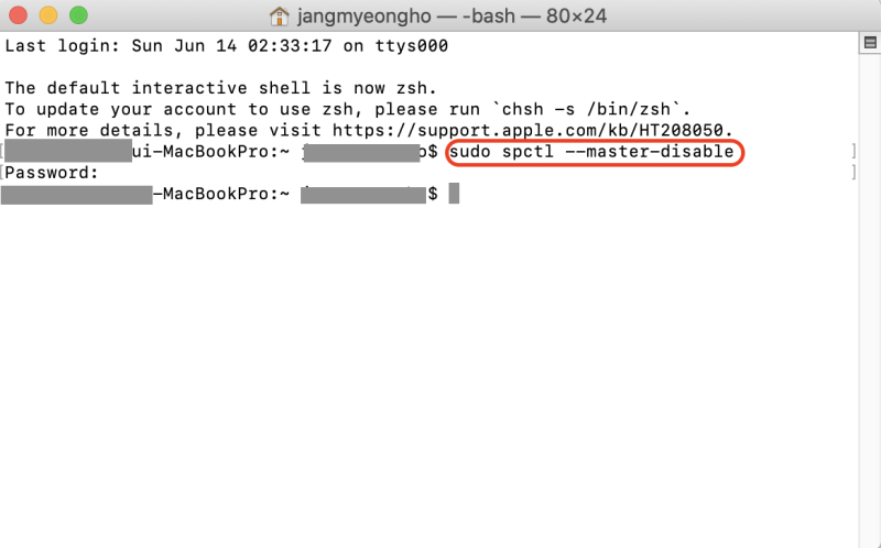 게이트키퍼 설정은 시스템 환경설정에서 직접 변경할 수 없기 때문에, 터미널을 통해 명령어로 처리해야 합니다.