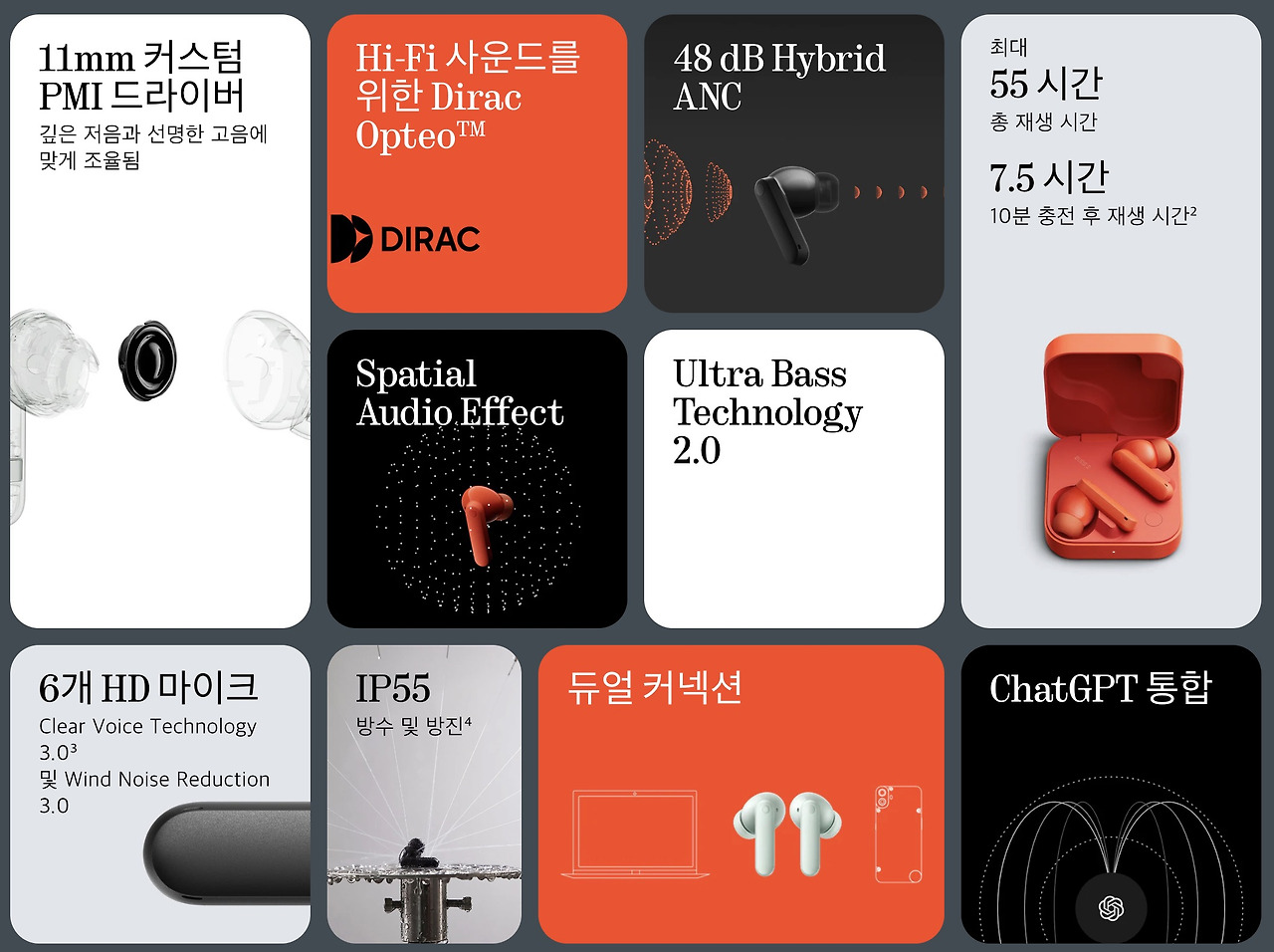 | Buds 2 | 11mm | IP55 | 최대 13.5시간 / 약 40시간 | 멀티포인트, ChatGPT 연동 |