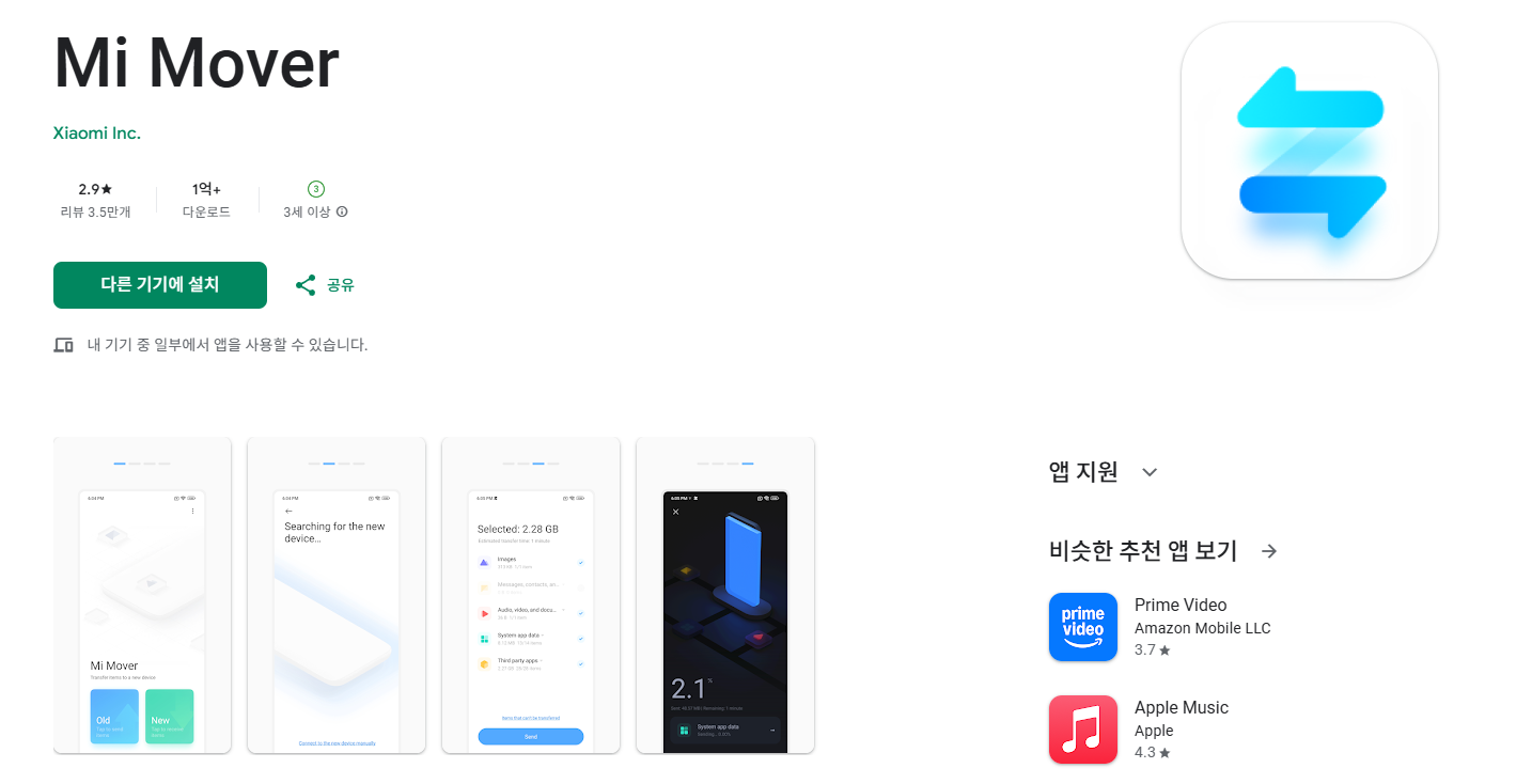 샤오미나 홍미노트 시리즈는 'Mi Mover'라는 전용 전송 앱을 제공합니다.