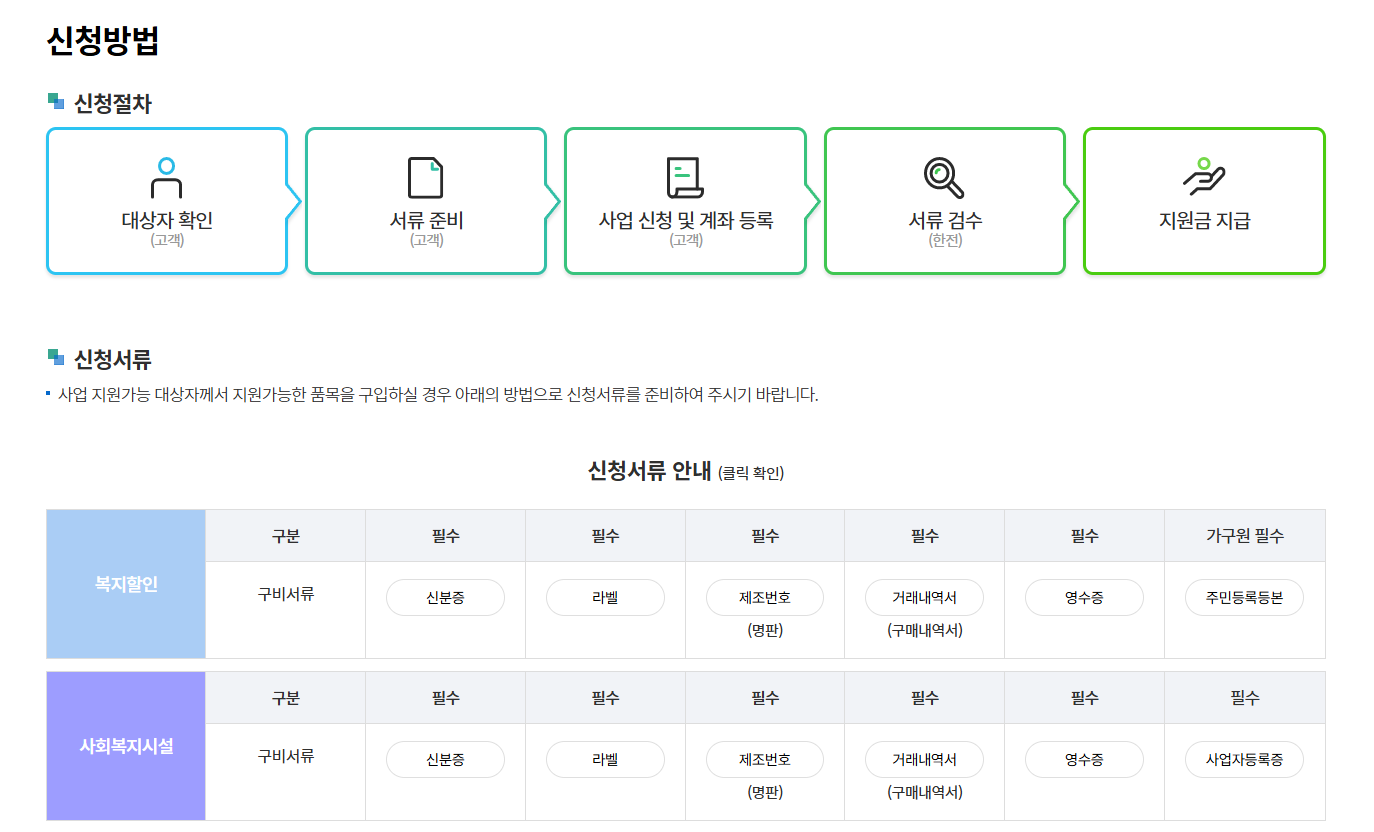 | 기타 안내 | 구역전기사업자로부터 전기를 공급받는 세대는 해당 지역 전기사업자를 통해 신청해야 함 |