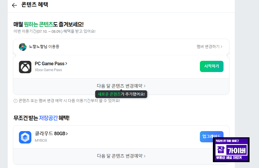 목록 중에서 ‘Xbox Game Pass 1개월 이용권’을 찾아 선택합니다. 선택 후 확인을 누르면 혜택이 곧바로 적용됩니다. 이때, 기존에 사용 중이던 콘텐츠는 변경 후 다시 사용할 수 없으니 신중하게 결정하세요.
