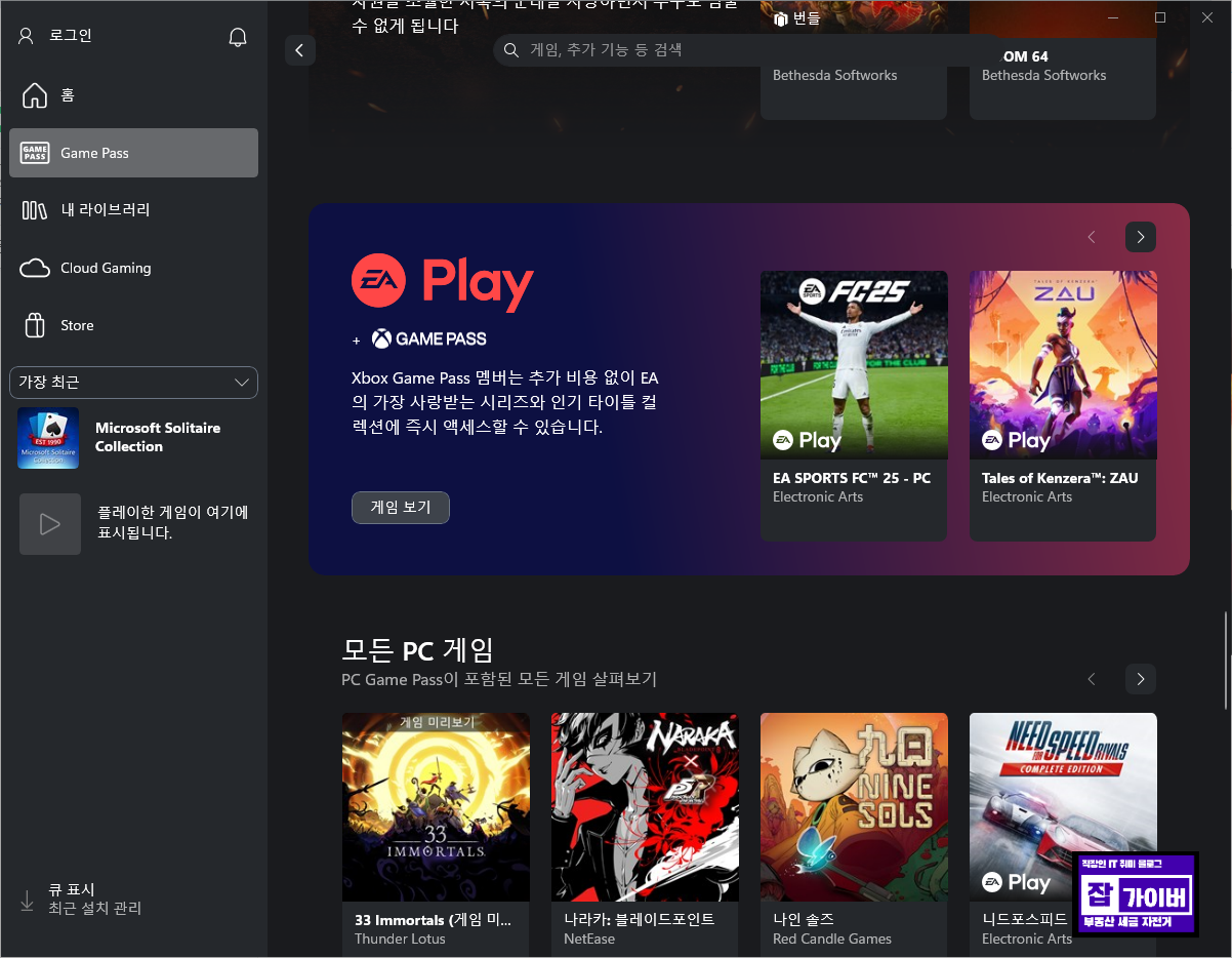 Game Pass 등록이 완료되면, Xbox PC 앱 을 설치하라는 안내가 뜹니다. 앱 설치 후 로그인하면 바로 다양한 게임들을 탐색하고 설치해 플레이할 수 있습니다.