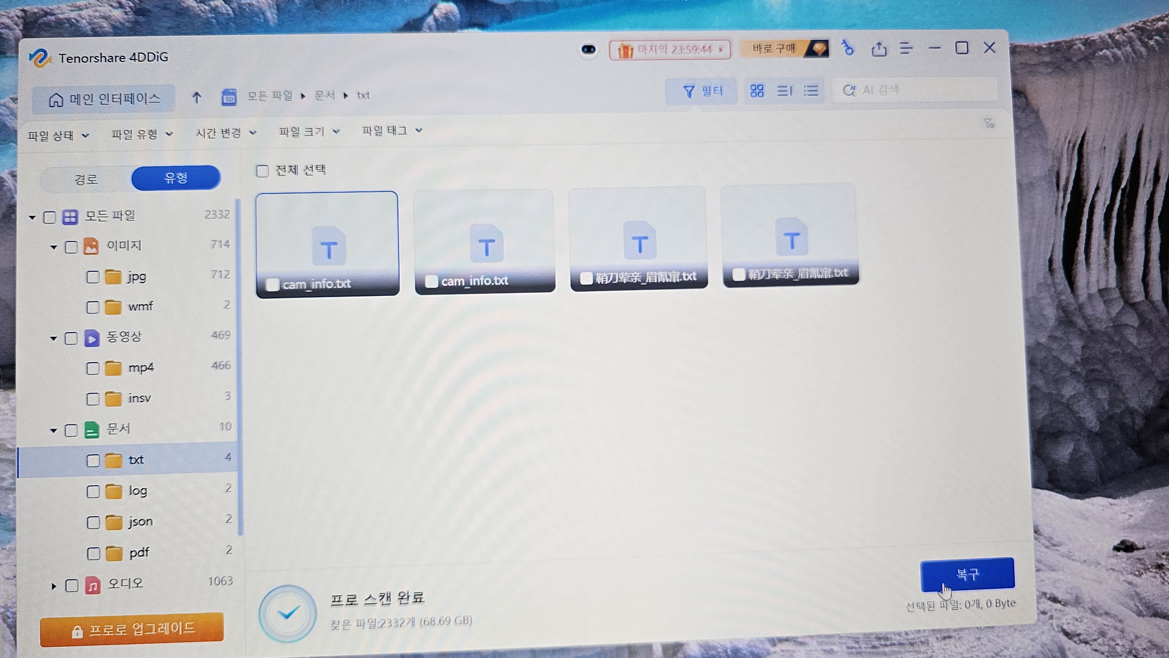 동영상 뿐만 아니라 TXT 한글문서까지 함께 복구가 가능가 가능합니다.