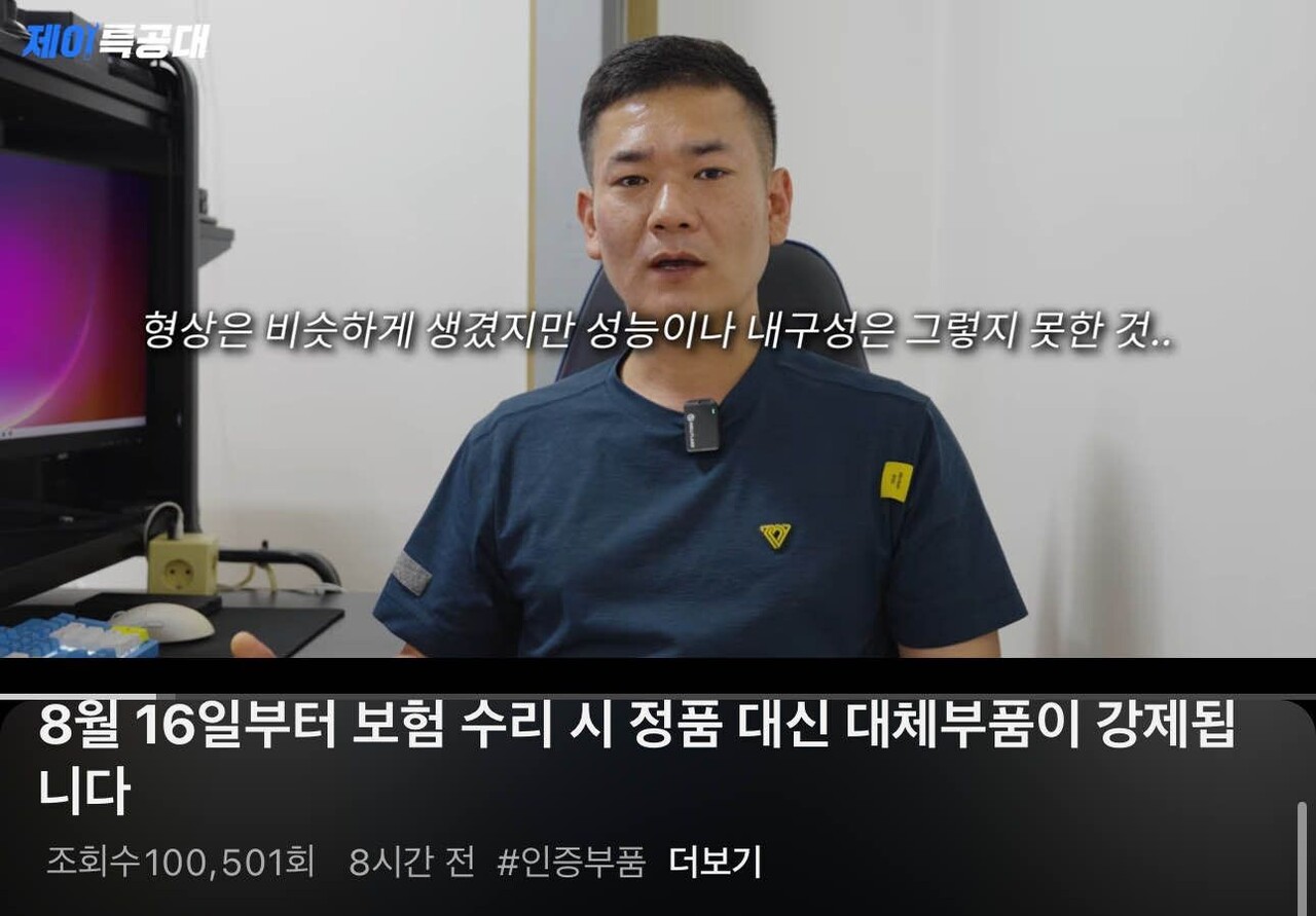 더 큰 문제는 고지 절차조차 명확하지 않다는 점이다. 유럽이나 미국처럼 소비자에게 사전 고지를 하고 선택권을 부여하는 제도가 아니기 때문에, 차량 수리 후 자신도 모르게 정품이 아닌 부품이 들어갔다는 사실을 뒤늦게 알게 되는 경우도 생길 수 있다.