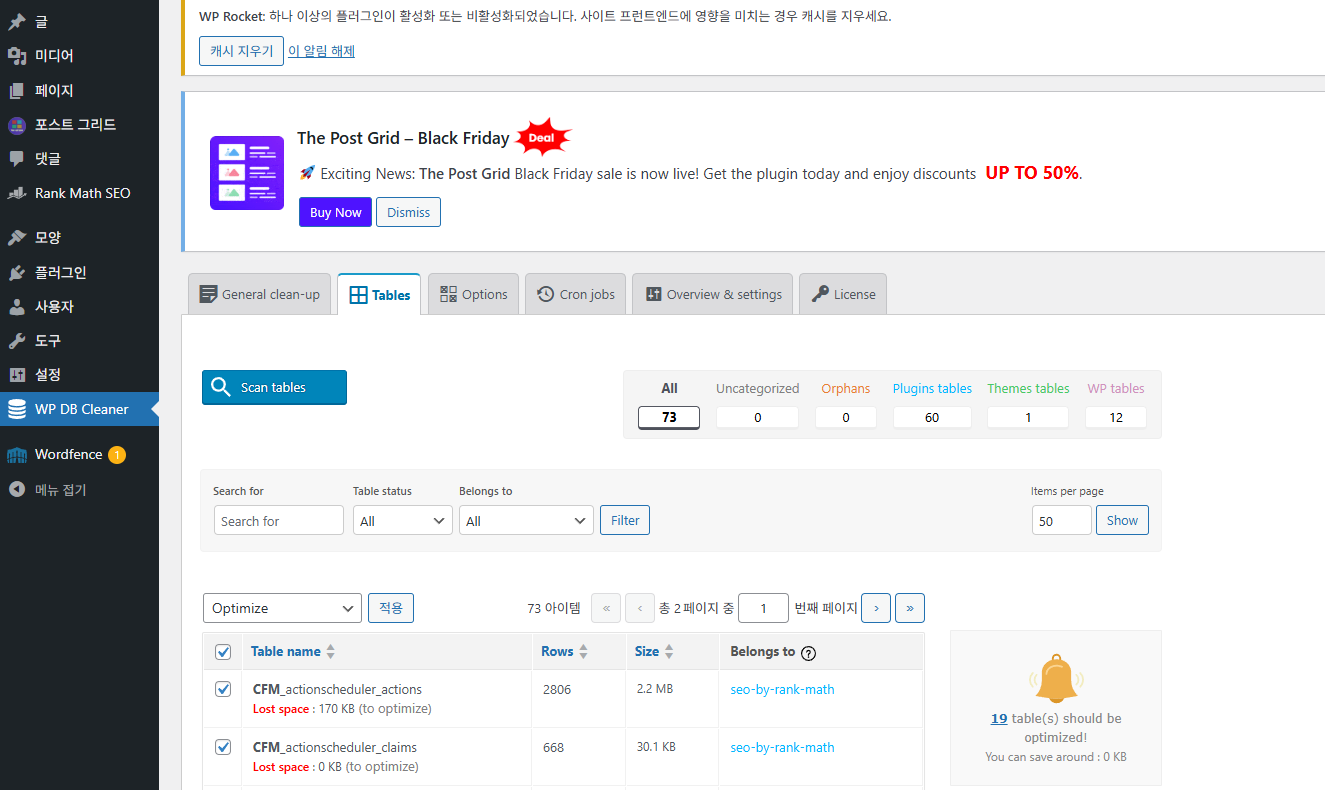 - WP-Optimize 또는 Advanced Database Cleaner 플러그인 설치