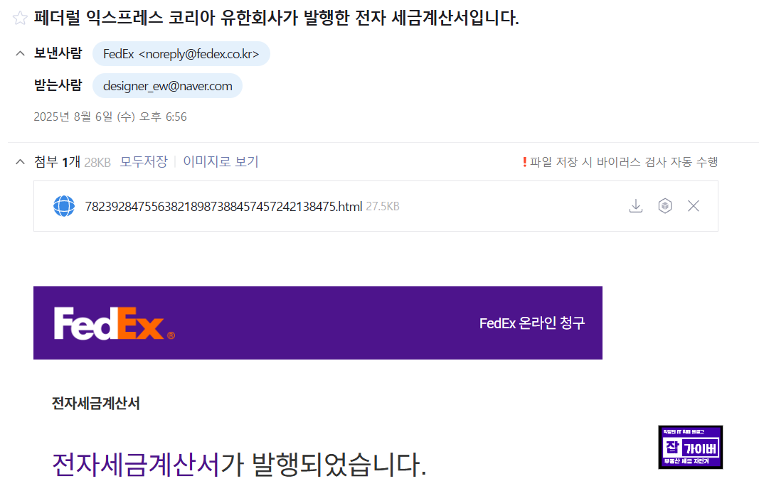 우선 메일에 보면 전자세금계산서가 발행되었다는 메일로 다른 페덱스 사기메일을 보면 택배가 온 사진과 함께 반품이 되었거나 하여 입금을 요구하는 메일이 대부분이다.