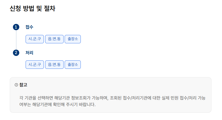 - 접수: 주민센터 또는 시·군·구청 민원창구에서 신청