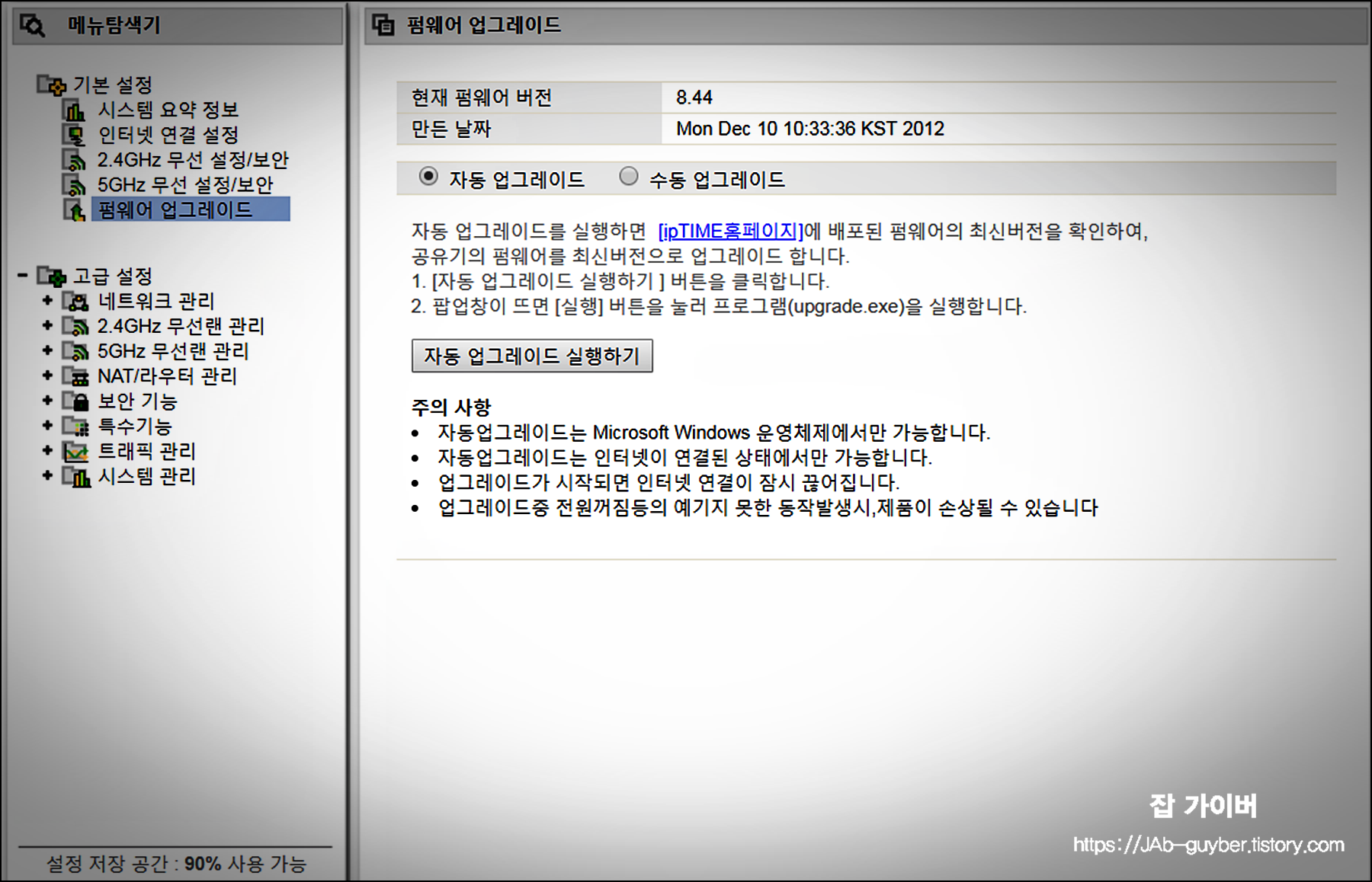 그리고 현재 사용하고 있는 아이피타임 무선공유기의 펌웨어 업데이트를 자동 업그레이드 및 수동업그레이드 설정이 가능합니다.